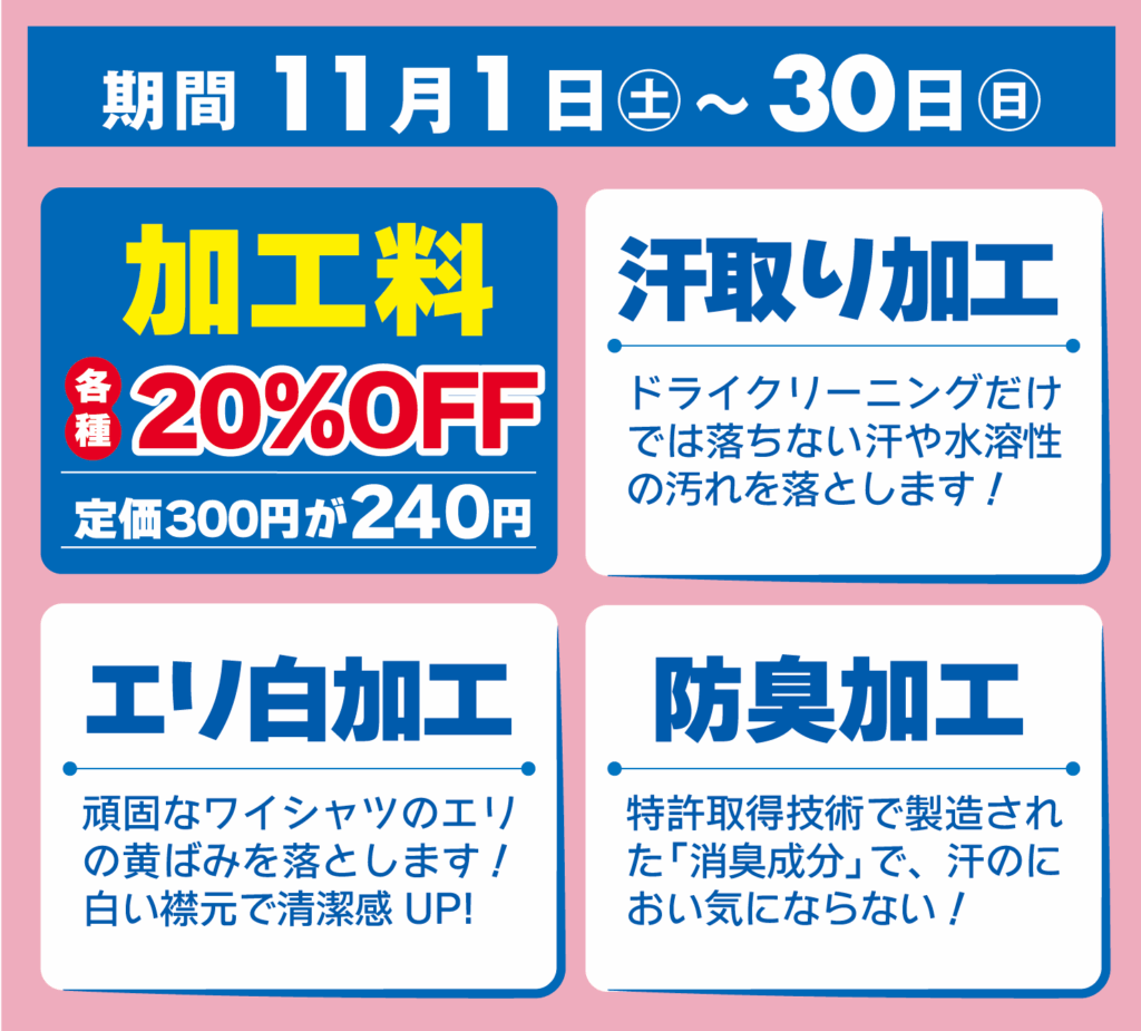 • 汗取り加工・エリ白加工・防臭→ 20%OFF